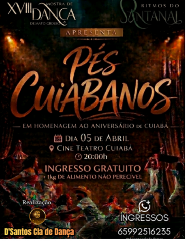 O espetáculo "Pés Cuiabanos" é uma homenagem à cidade de Cuiabá, celebrando sua cultura, tradições, musicalidade e identidade regional. Por meio da dança, o espetáculo percorre elementos históricos e simbólicos da capital matogrossense, valorizando suas raízes, seu povo e sua diversidade artística. Uma obra que une emoção, pertencimento e expressão corporal, exaltando a força da cultura cuiabana.